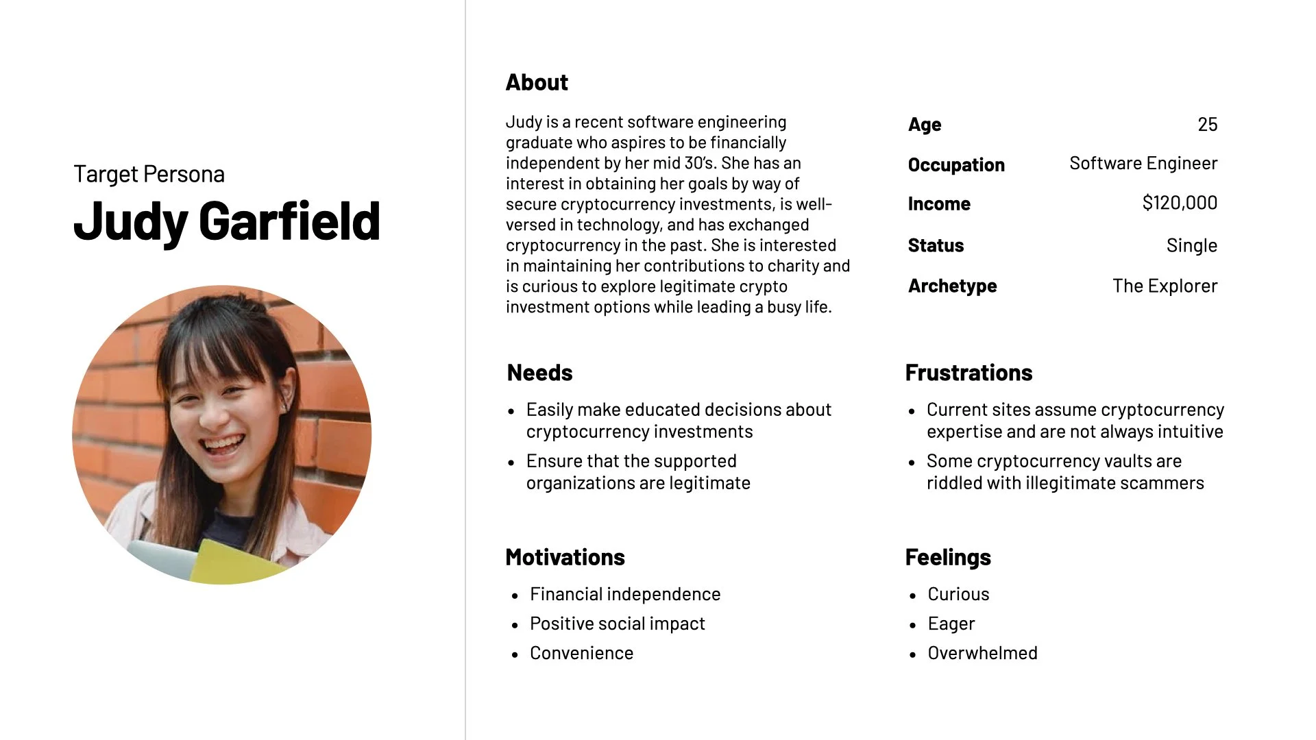 Working with stakeholder insights, I developed a persona representing Altrucoin's target user: someone curious about crypto but not yet confident navigating complex financial interfaces. Judy needed to easily compare investment options and - as an admin - create and manage vault pools without confusion.