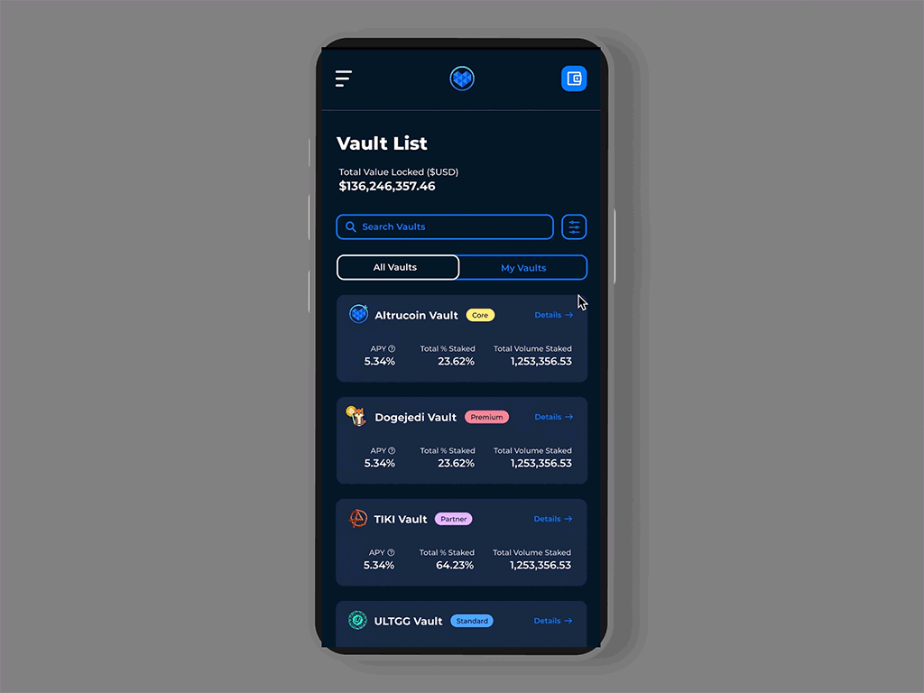The vault list uses clear hierarchy, accessible colors, intuitive filtering, and a table format that enables easy comparison across options.