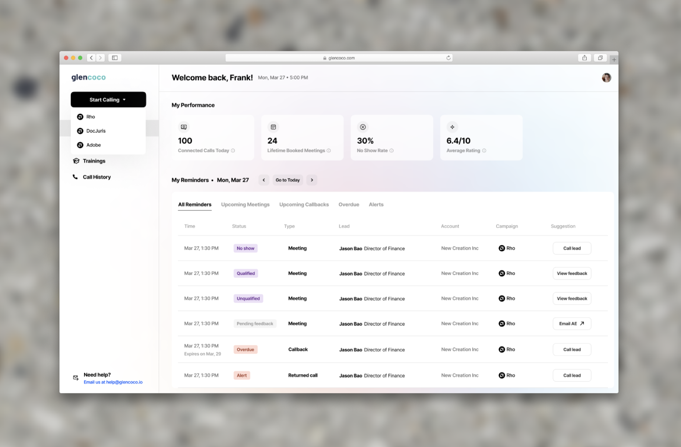 Glencoco is a sales marketplace that connects businesses with on-demand consultants. By integrating calling, training, and performance tracking in one platform, Glencoco enables companies to scale outbound efforts efficiently while empowering consultants to build sales skills and earn flexible income.