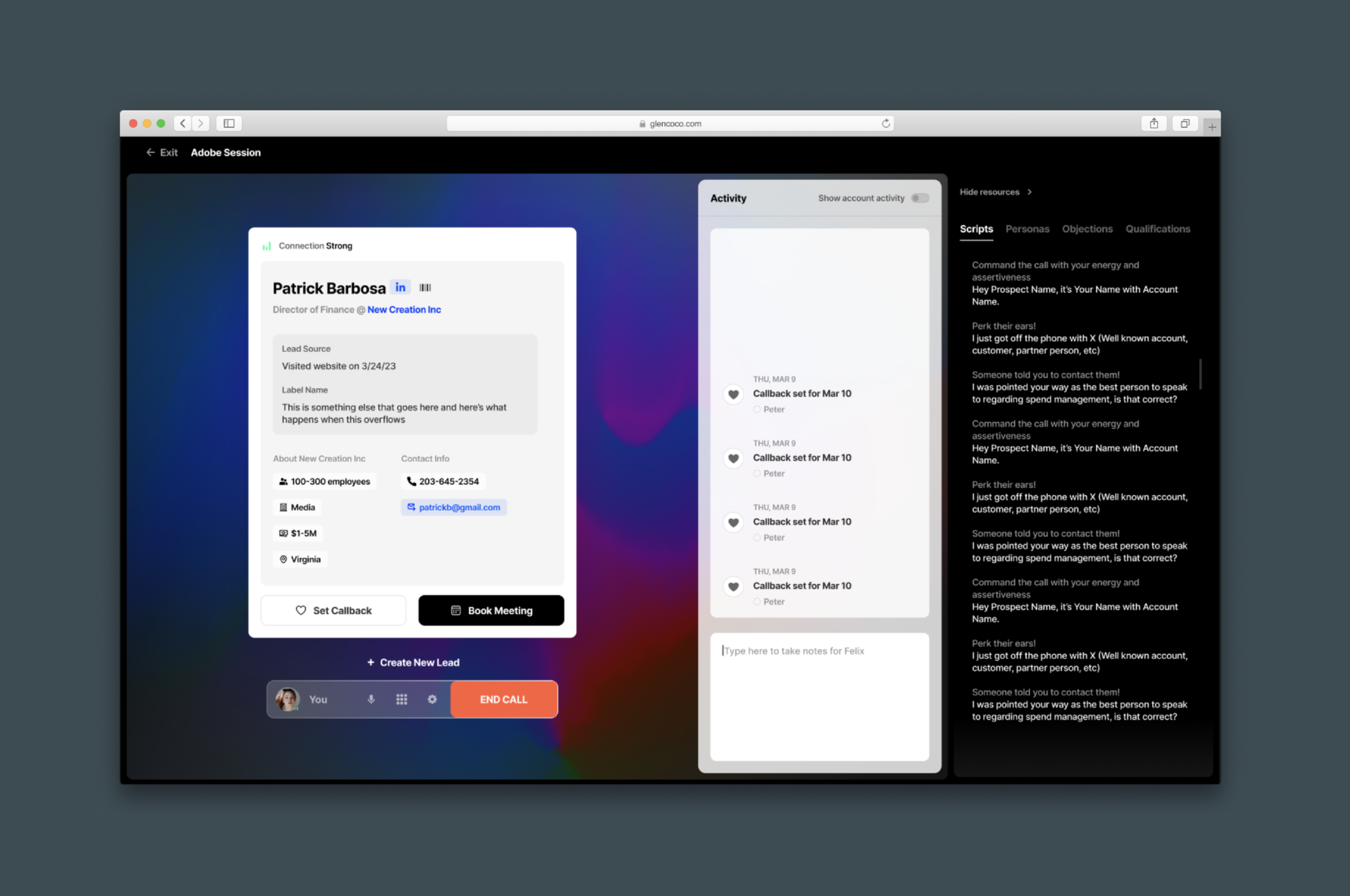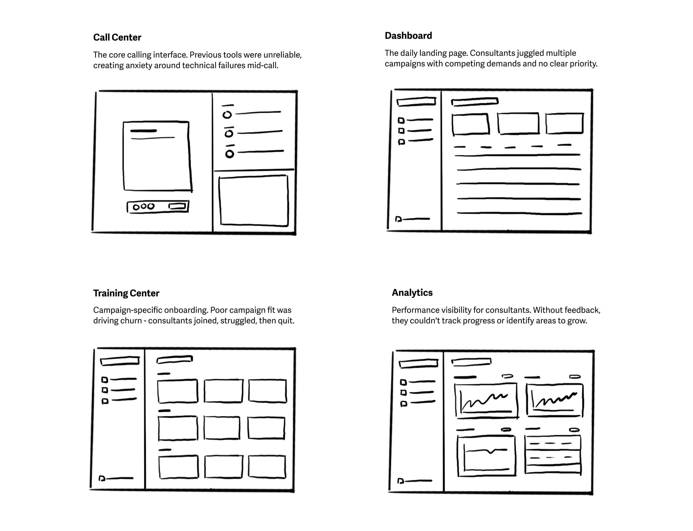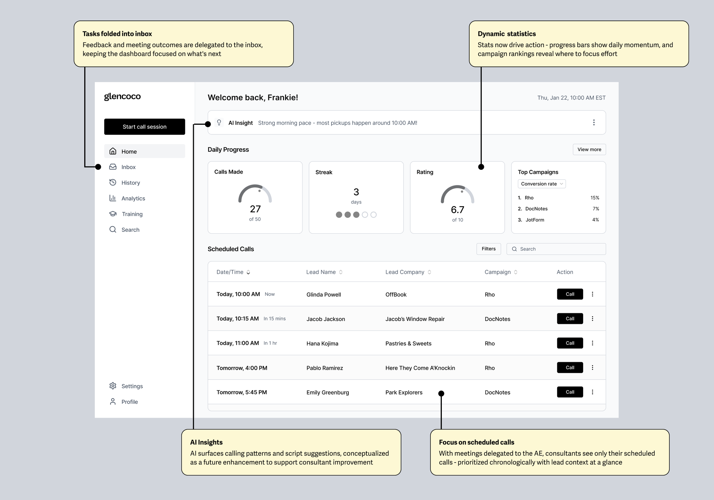 I joined as the founding designer during Glencoco's MVP-to-platform transition. I conducted consultant research to validate the roadmap, designed the calling, training, and analytics experiences, and shipped the platform in 4 months to 500+ active users.